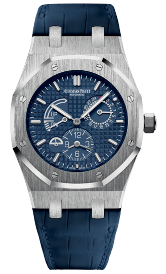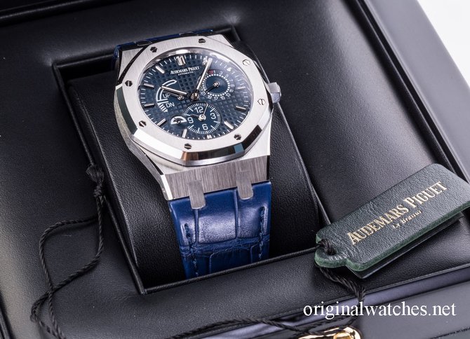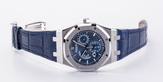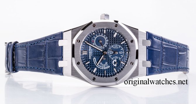 Швейцарские часы Audemars Piguet Royal Oak Dual Time имеют корпус из нержавеющей стали, в котором установлен автоматический механический калибр 2329 / 2846 мануфактурного производства компании Audemars Piguet. Механизм обеспечивает работу таких функций: часы, минуты, секунды, дата, индикатор день/ночь, запас хода, второе время. Габариты корпуса: 39 мм и толщина 10.3 мм. Циферблат мастерски гильоширован вручную. Запас хода механизма обеспечивает работу часов без подзавода минимум 38 часов. Часы укомплектованы ремешком синего цвета из кожи аллигатора. Водонепроницаемость корпуса - 50 метров.