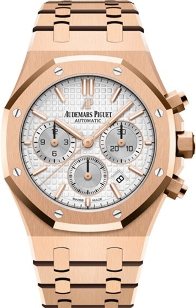 Швейцарские наручные часы Audemars Piguet Royal Oak Selfwinding Chronograph 38 mm 26315OR.OO.1256OR.02 представлены на мануфактурном автоматическом механизме 2385 с 40-часовым запасом хода и функцией хронографа. Стрелки, которыми показываются данные текущего времени, выполнены из розового золота и покрыты люминесцентным составом. Корпус из розового золота отличается 50-метровой водонепроницаемостью. Размер корпуса: 38 х 11 мм. Лицевая часть защищена стеклом из сапфирового кристалла с противобликовым составом. Модель Audemars Piguet Royal Oak Selfwinding Chronograph выпущена ограниченной серией из 200 экземпляров.