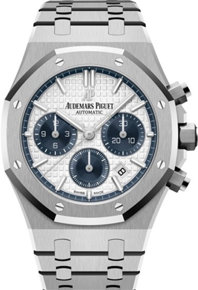 Наручные часы от Audemars Piguet, модель Royal Oak Selfwinding Chronograph 38 mm 26315ST.OO.1256ST.01, выпущены в корпусе из нержавеющей стали, размером 38 х 11 мм. Водонепроницаемость этого корпуса рассчитана на погружение под воду до 50 метров глубины. Внутри корпуса размещен автоматический механизм 2385 мануфактурного производства бренда Audemars Piguet с запасом хода на 40 часов. На белом гильошированном циферблате с голубыми субциферблатами осуществляется индикация часов, минут, секунд, даты и хронографа. Комплектуется модель стальным браслетом. Водонепроницаемость корпуса часов Audemars Piguet Royal Oak Selfwinding Chronograph - 50 метров. Часы выпущены в 2019 году.