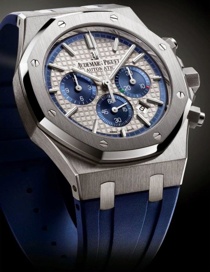 Новинка 2015 года от бренда Audemars Piguet - наручные часы с хронографом Royal Oak Chronograph Italy Limited Edition 500, которые, как следует из названия, выпущены ограниченной серией 500 экземпляров, в честь всемирной выставки "Экспо-2015", проходившей в Милане в 2015 году. Иными словами, часы посвящены Италии и итальянскому городу Милану. Круглый стальной корпуса имеет диаметр 41 миллиметр и 10.95 миллиметров в толщину. Водонепроницаемость 50 метров. Традиционно, на заводной головке выгравирован логотип компании Audemars Piguet. Безель крепится к корпусу восемью винтами. Гильошированный циферблат с отделкой Grande Tapisserie, с синими круглыми счетчиками хронографа. Сапфировое стекло с антибликовым покрытием. Часовые индексы накладные. Часовые стрелки произведены из белого золота и покрыты люминесцентным составом. Часовой механизм с автоматическим подзаводом, состоит из 304 элементов, 37 из которых - драгоценные камни. Балансовая частота - 21600 пк/час. Запас хода - 40 часов. Часы поставлятся на каучуковом реине синего цвета с расклядной застежкой из стали. В комплекте так же идет дополнительный ремень из кожи крокодила синего цвета.