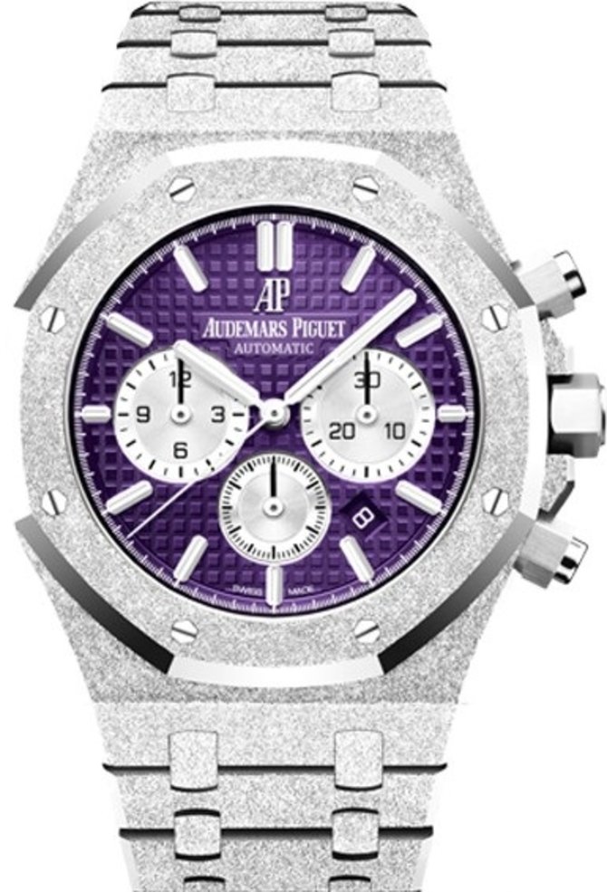 В корпусе из белого золота с пескоструйной обработкой, который обладает 50-метровой водонепроницаемостью, представлены швейцарские часы Audemars Piguet Royal Oak Royal Oak Chronograph 41 mm 26331BC.GG.1224BC.01, функционирующие на базе автоматического механизма 2385 мануфактурной сборки специалистов Audemars Piguet. Этот механизм обеспечивает индикацию часов, минут, секунд и даты, а также данных спортивной функции хронографа. На руке часы крепятся браслетом из белого золота. Стекло, установленное для защиты циферблата, изготовлено из сапфирового кристалла. Лимитированный тираж наручных часов Audemars Piguet Royal Oak Royal Oak Chronograph составляет 200 экземпляров.