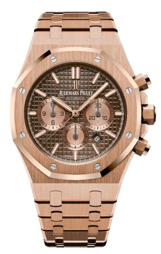 Часовая компания из Швейцарии Audemars Piguet представляет наручные часы с функцией хронографа Royal Oak Chronograph 41 mm 26331OR.OO.1220OR.02. Новинка выпущена в корпусе из розового 18-каратного золота. Диаметр корпуса - 41 мм. Внутри него расположен автоматический мануфактурный Калибр 2385. Он обеспечивает индикацию на гильошированном циферблате часов, минут, секунд, даты и, естественно, данных хронографа. Механизм гарантирует запас хода 40 часов. Браслет также из розового 18-каратного золота. Водостойкость корпуса - 50 метров. Сапфировое стекло с антибликовым покрытием отвечает за сохранность циферблата. Кнопки хронографа находятся вокруг заводной головки. На корпусе присутствуют как матовые, так и полированные элементы. Безель фиксированный титановыми винтами.