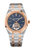 Модель швейцарских часов от бренда Audemars Piguet - Royal Oak Tourbillon Extra-Thin 26522TI.OO.1220TI.01 представлена производителем в корпусе из титана, размером 41 х 9 мм. Механизм, установленный в данной модели, отличается функцией турбийона для нивелирования влияния земной гравитации на точность хода механизма. Калибр 2924 работает от ручного подзавода, имеет запас хода на 70 часов. На синем гильошированном циферблате со скелетонированным окном турбийона показываются данные часов и минут. Часовые метки со стрелками были покрыты люминесцентным составом для комфортного считывания показаний в темноте. Часы укомплектованы титановым браслетом с раскладной пряжкой. Водонепроницаемость корпуса - 50 метров. Год выпуска: 2019. Часы выпущены лимитированной серией - 70 экземпляров.