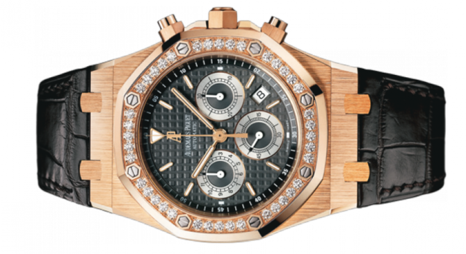 Бренд - Audemars Piguet (26557OR.ZZ.D098CR.02). Коллекция - ROYAL OAK. Стиль - мужской. Материал корпуса – розовое золото 18к. Циферблат – черный гильошированный, украшенный бриллиантами. Механизм – автоматический. Функции - часы, минуты, секунды, дата, хронограф