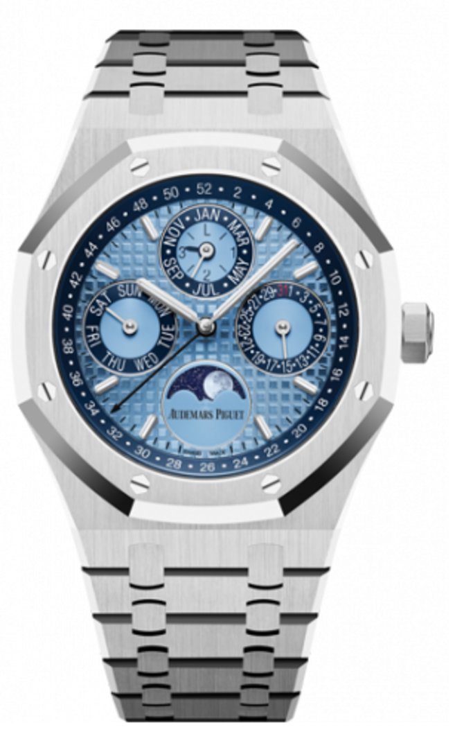 Компания Audemars Piguet представляет великолепные часы Royal Oak Perpetual Calendar 41 Platinum 26574PT.OO.1220PT.01. Одно из главных достоинств данной модели - это наличие индикатора лунных фаз. Круглый корпус часов с гайкообразным безелем выполнен из платины. Параметры корпуса: 41 мм в диаметре и 9.5 в толщину. На голубом гильошированном циферблате показываются текущее время, дни недели, месяц и дата. Прочное сапфировое стекло защищает циферблат от повреждений. Автоматический механизм с запасом хода на 40 часов и частотой баланса 19800 пк/час. Браслет платиновый, с раскладной застежкой в комплекте. Лимитированный тираж - 50 экземпляров.