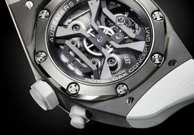 Новинка 2014. Яркие, белого цвета, отполированные, мощные — часы Royal Oak Concept GMT Tourbillon будут впервые представлены на Международной выставке высокого часового искусства (SIHH) в 2014 году в Женеве. Это модель для передовых коллекционеров и знатоков, не терпящих компромиссов – ни в технических, ни в эстетических вопросах. Центральная часть корпуса, выполненная из титана, и встроенный каучуковый ремешок сочетаются с белым керамическим безелем, обрамляя архитектурную структуру каретки турбийона и экран второго часового пояса — безукоризненная гармония корпуса и механизма. Однако новое в 2014 году — яркий центральный элемент чистого белого цвета — сложнообработанный верхний мост из белой керамики; его появление стало возможным только сейчас, благодаря непрекращающемуся прогрессу Audemars Piguet в области материаловедения. Белая керамика примерно в девять раз прочнее стали, что означает, что изготовление безеля, кнопки-пушера, заводной головки и особенно верхнего моста сложной формы – процесс сложный и долгий. Керамика – практически не подверженный абразивному износу композитный материал, шлифовка которого возможна только алмазом – поэтому для обработки используются специальные фрезерные станки, оборудованные алмазными наконечниками. Учитывая присущую керамике высокую абразивную устойчивость, полировка и сатинирование поверхностей и углов после черновой шлифовки являются настоящим техническим подвигом. На изготовление безеля Royal Oak Concept GMT Tourbillon затрачивается 8 часов, тогда как если бы он был изготовлен из стали, на это потребовалось бы всего 45 минут; при этом требуется задействовать все умения и знания часовых мастеров и инженеров. После окончательной обработки керамики не только получается гладкая поверхность, у керамики есть и практическое качество – очень высокая износоустойчивость. Также и титан, из которого изготовлена середина корпуса, и сапфировое обрамление очень прочны, удобны при ношении и вдвое легче стали – это является