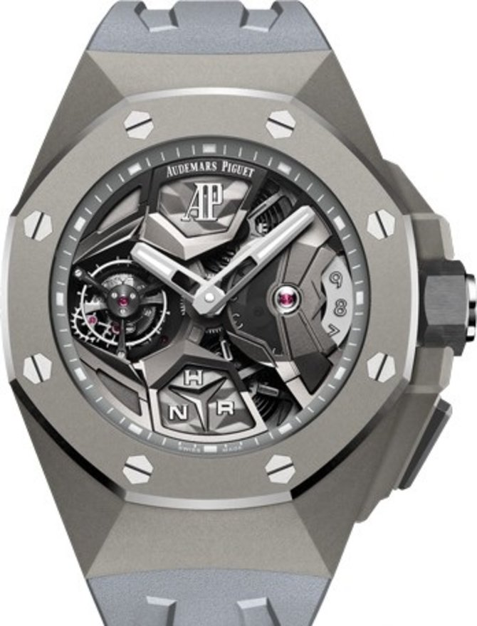 Часы Royal Oak Concept Concept Flying Tourbillon GMT от швейцарского производителя Audemars Piguet работают на базе механического калибра 2954 с ручным подзаводом, функциями индикации второго времени и турбийона, запасом хода на 10 дней. Серый скелетонированный циферблат накрыт стеклом из сапфира. Корпус круглой формы, диаметром 44 х 16.1 мм, изготовлен из высококачественного титана. Ремень из каучука серого цвета дополнен пряжкой из титана. Водостойкость корпуса - 100 метров. Прозрачный сапфировый кристалл защищает корпус и с обратной стороны, демонстрируя работу установленного калибра. Год выпуска швейцарских часов - 2020. Ограниченный тираж - 30 экземпляров на весь мир.