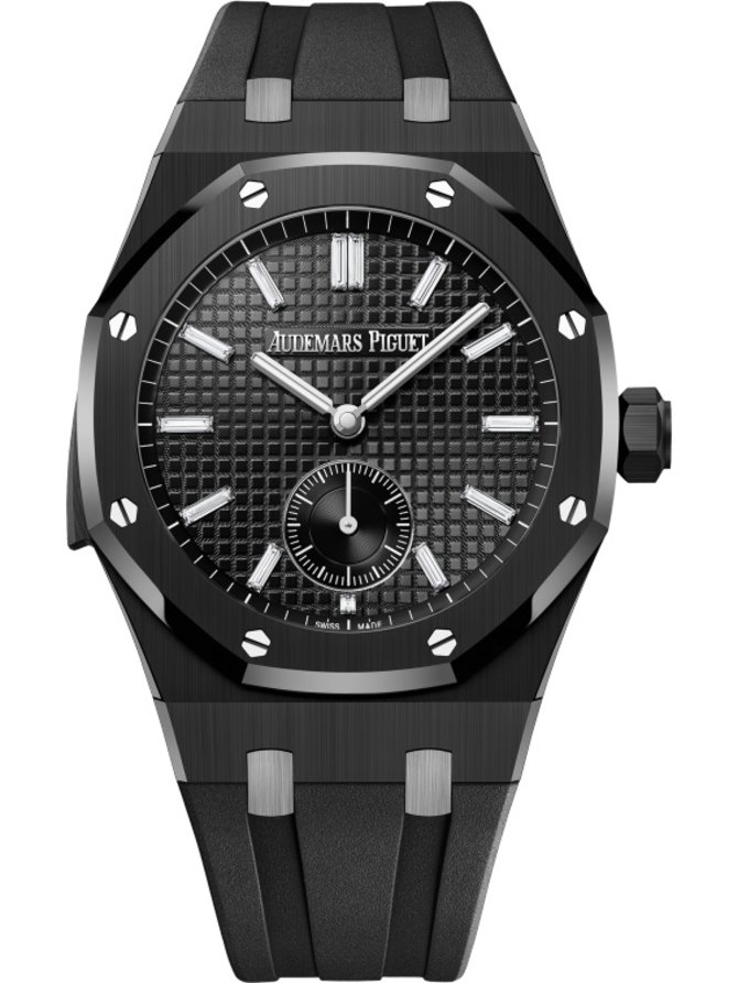 Швейцарские часы Royal Oak Supersonnerie 26591CE.OO.D002CA.02 от компании Audemars Piguet выпущены с функцией минутного репетира с боем в корпусе из черной керамики, диаметром 42 мм. Циферблат с узором «Grande Tapisserie» закрыт сапфировым стеклом с антибликовым покрытием. Также модель оснащена завинчивающейся заводной головкой. Водонепроницаемость корпуса - 20 метров. Накладные часовые метки представлены из белых багетных бриллиантов, а стрелки Royal Oak из белого золота покрыты люминесцентным покрытием. Ремешок из черного каучука дополнен раскладной застежкой AP из титана. Калибр 2953 с ручным подзаводом обладает функцией минутного репетира и 72-часовым запасом хода.