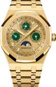 Астрономические швейцарские часы с вечным календарем от компании Audemars Piguet - модель Royal Oak Perpetual Calendar 26615TI.OO.1220TI.01. Часы выпущены в 2021 году лимитированной серией в 300 экземпляров в круглом корпусе из титана, размером 41 х 9.5 мм. Часы функционируют на базе мануфактурного автоматического калибра 5134 с запасом хода на 40 часов работы. На гильошированном циферблате, накрытом сапфировым стеклом, показываются часы, минуты, секунды, дата, день недели, месяц, год, фаза луны, цикл високосного года. Часовые метки и стрелки заполнены люминесцентным составом. Безель зафиксирован 8-ю винтами. На запястье руки часы крепятся браслетом из титана с раскладной застежкой. Задняя крышка из сапфирового стекла открывает вид на работу механизма. Водонепроницаемость корпуса - 20 метров.