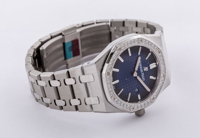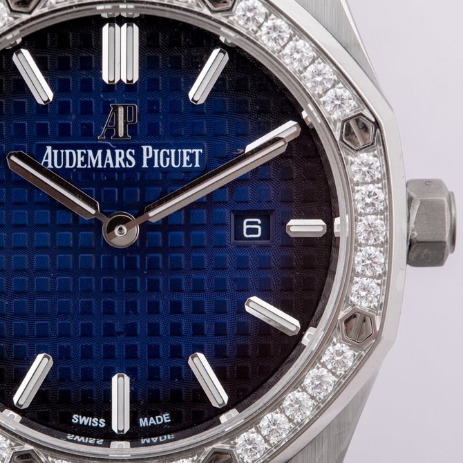 Модель Audemars Piguet Royal Oak Quartz Platinum and Titanium 67651IP.ZZ.1261IP.01 выполнена в традиционном для коллекции Royal Oak стиле - круглый корпус с основаниями, плавно переходящими к прочному браслету. Корпус ювелирных часов изготовлен в комбинации двух дорогих металлов - платины и титана. Безель корпуса, имеющий форму гайки, украшен бриллиантами классической огранки. На гильошированном вручную циферблате синего цвета указываются часы, минуты и дата. Бриллиантов на корпусе - 40, общим весом 0.73 ct. Браслет также комбинированный и также из платины и титана. Застежка раскладывается. Лицевое стекло сапфировое. Калибр AP 2713, мануфактурной разработки Audemars Piguet - кварцевый, т.е. работает от батарейки. Герметичность корпуса повышенная - 50 метров. Габариты корпуса достаточно практичны для ежедневного использования и для женской руки - 33 мм в диаметре и 7 мм.