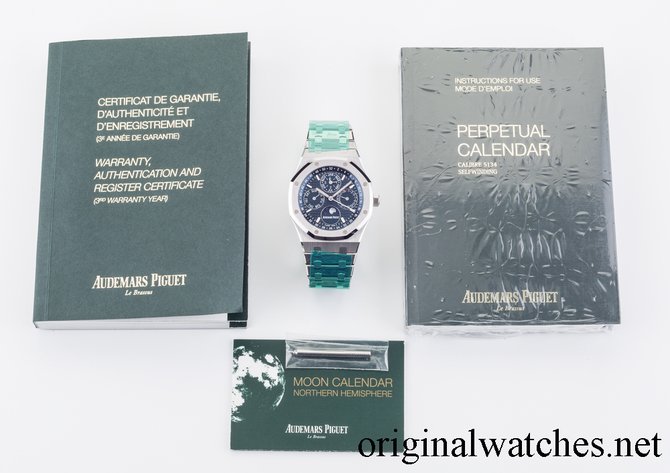 Компания Audemars Piguet в 2015 году представила новую модель астрономических наручных часов с функцией вечного календаря в корпусе из нержавеющей стали, диаметром 41 миллиметр и толщиной 9.5 миллиметров. Часы функционируют на мануфактурном механизме с автоматическим подзаводом и 40-часовым запасом хода, Калибр 2385, гарантирующем индикацию на синем гильошированном циферблате таких функций: часы, минуты, секунды, дата, день недели, неделя, месяц, цикл високосного года, фаза Луны. Механизм состоит из 374 элементов. Балансовая частота 2,75 Гц. Корпус с двух сторон, лицевой и задней, защищается от разного рода повреждений сапфировым стеклом. Модель поставляется с браслетом из нержавеющей стали и раскладывающейся застежкой. Герметичность корпуса минимальна - 20 метров. Стрелки и часовые метки с люминесцентным составом.