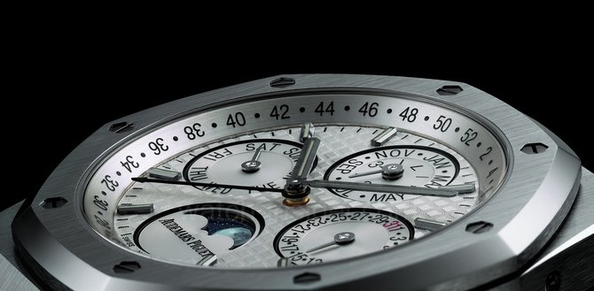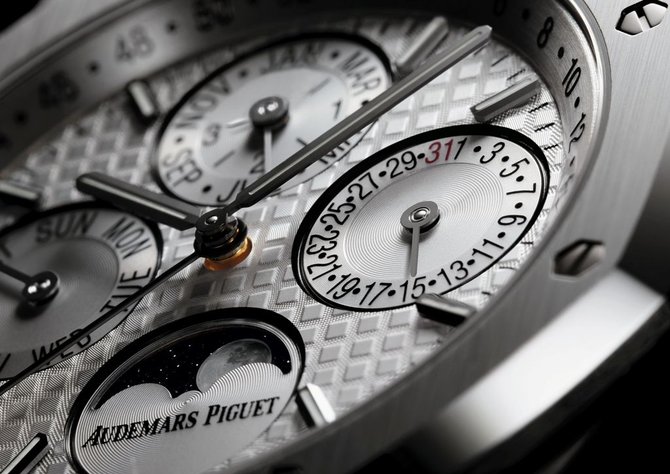 Современная эстетика и уникальные часовые усложнения сочетаются в представленной новой модели механических часов, выпущенной компанией Audemars Piguet в 2015 году. Часы вошли в коллекцию Royal Oak. Главная их особенность - это вечный календарь. Корпус часов выполнен из нержавеющей стали. Циферблат защищен сапфировым стеклом с антибликовым покрытием. Диаметр корпуса - 41 мм, толщина - 9.5 мм. Стрелки часов с люминесцентным покрытием. Браслет из нержавеющей стали с раскладывающейся застежкой AP. Механизм часов с автоматическим подзаводом, то есть работает от естественных движений руки владельца (Калибр 5134). Запас хода механизма - 40 часов. Балансовая частота - 2.75 HZ. Корпус герметичен до 20 метров глубины. Функции циферблата: часы, минуты, секунды, дата, день недели, неделя, месяц, цикл високосного года, фаза Луны.