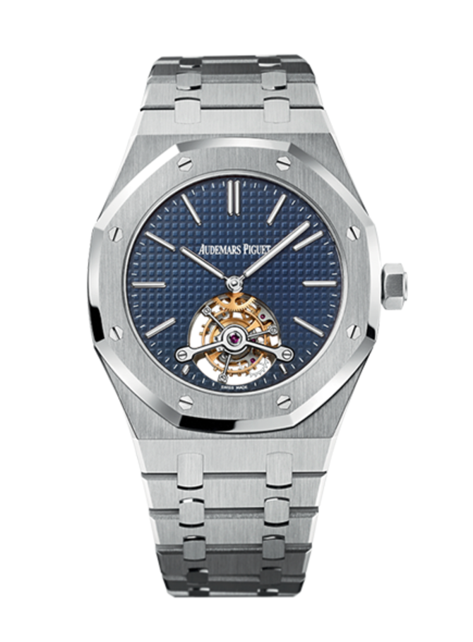 Стильные швейцарские наручные часы с функцией турбийона "Royal Oak Tourbillon" от часовой мануфактуры Audemars Piguet представлены в корпусе из качественной нержавеющей стали, диаметром 41 мм и толщиной 8.85 мм. Безель корпуса гайкообразной формы завинчен восемью винтами. На гильошированном синем циферблате расположено окошко турбийона и стрелки для индикации часов и минут. Циферблат закрыт сапфировым стеклом. Механические часы функционируют на мануфактурном швейцарском механизме с ручным подзаводом, калибр 2924. Запас хода механизма - 70 часов. Балансовая частота - 21600 п/ч (3 Гц). Браслет из нержавеющей стали с раскладывающейся пряжкой. Водостойкость корпуса не высокая - 50 метров. На задней стороне часов расположен индикатор запаса хода.
