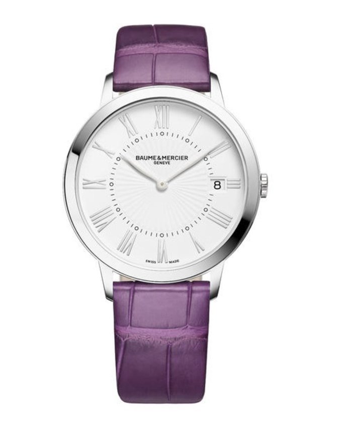Часовая швейцарская компания премиум-класса BAUME & MERCIER представляет элегантную модель швейцарских часов, вошедшую в коллекцию "CLASSIMA". На светлом часовом циферблате указывается текущее время и дата. Стрелки и римские цифры сделаны из стали. Элегантный циферблат, созданный в минималистическом и классическом стиле, надежно защищается сапфировым стеклом. Выполнение заявленных функций осуществляется благодаря швейцарскому кварцевому механизму, установленному в круглом полированном корпусе из нержавеющей стали. Толщина корпуса всего 5.65 миллиметров. Производитель, т.е. часовая мануфактура BAUME & MERCIER, укомплектовал представленные часы фиолетовым ремешком из натуральной кожи луизианского крокодила. Классическая застежка из нержавеющей стали. Герметичность, заявленная брендом-производителем, минимум 50 метров. Данная модель была разработана в 2015 году.