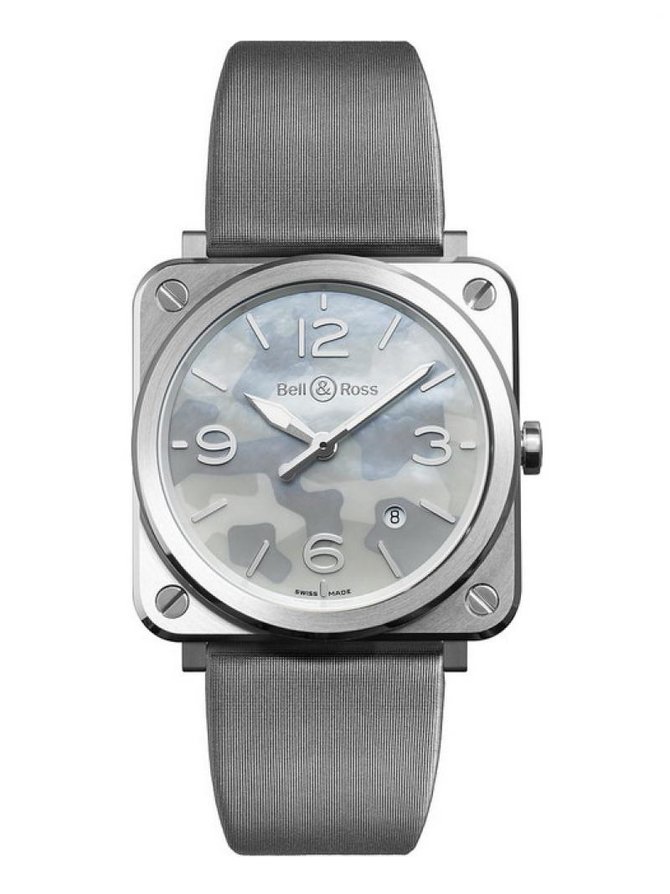 Кварцевые женские наручные часы BRS GREY CAMOUFLAGE в 2015 году представила часовая компании Bell & Ross. Модель является прототипом известных BR 01, вышедших в 2005 году в квадратном корпусе с авангардистским дизайном, а точнее, выпущена в честь десятилетнего юбилея этих часов. Компания посвятила эти часы прекрасному полу. Женские часы BRS GREY CAMOUFLAGE вышли в двух вариантах - 1) в стальном корпусе с перламутровым камуфлированным циферблатом; 2) в стальном корпусе, инкрустированном бриллиантами, с перламутровым камуфлированным циферблатом. В представленных часах впервые в часовой индустрии на натуральном перламутровом циферблате используется узор "камуфляж". Корпус с атласной отделкой. Ремешок часов, идущий в комплекте, сатиновый. Застежка на ремешке - классическая, выполнена из нержавеющей стали. Часовой механизм - кварцевый. Защитное лицевое стекло - сапфировое.
