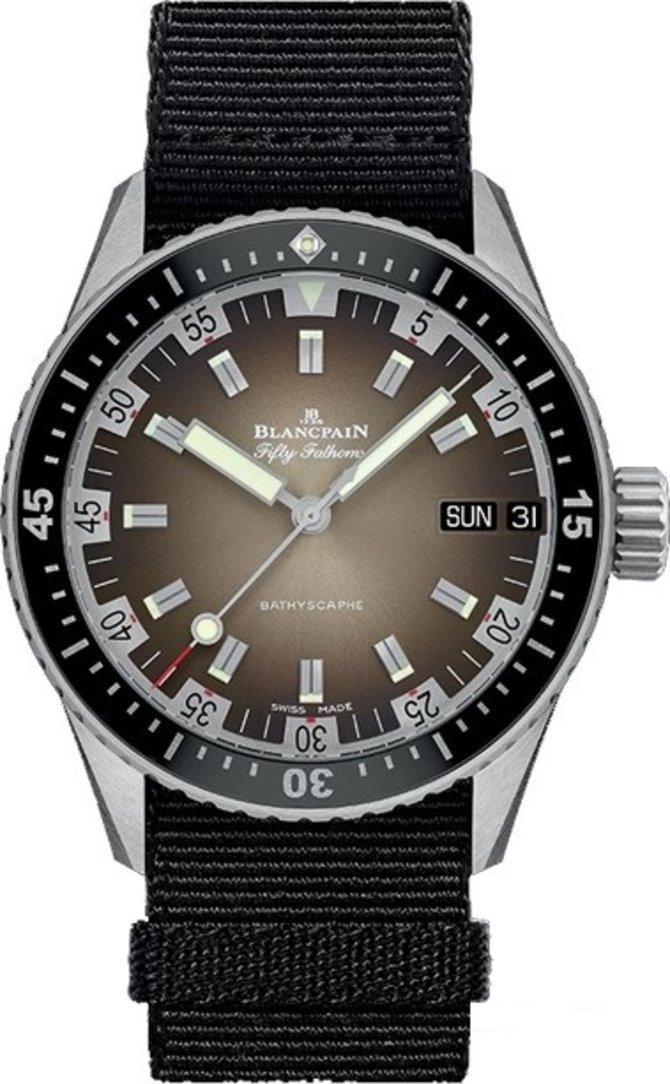 Швейцарские наручные часы Blancpain Fifty Fathoms Bathyscaphe Jour Date 70 были представлены маркой Blancpain в круглом корпусе из нержавеющей стали, выполненном в таких размерах: 43 х 14.25 мм. Водонепроницаемость корпуса невысокая - 30 метров. Модель работает на установленном внутри корпуса автоматическом механизме. Часы, минуты, секунды, дата, день недели - эти функции указываются на коричневом циферблате, защищенном стеклом из сапфирового кристалла. В комплекте с моделью Blancpain Fifty Fathoms Bathyscaphe Jour Date 70 идет текстильный ремешок с вставкой из нержавеющей стали в виде застежки. Но основная особенность модели - это дайверская водонепроницаемость на уровне 30 бар, что равняется 300 метрам. Безель часов вращается в одном направлении.