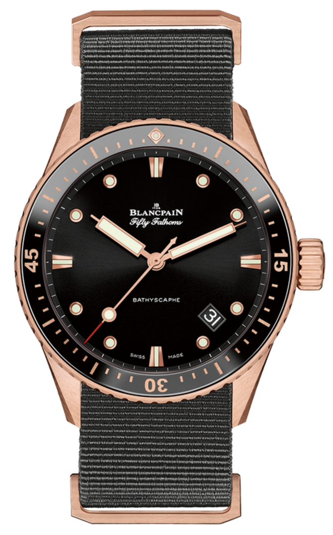 Часовая компания Blancpain пополнила коллекцию "Fifty Fathoms" моделью наручных часов "Bathyscaphe Ceramic insert and Ceragold" в круглом корпусе из розового золота с керамическим безелем, диаметром 43 миллиметра. Корпус обладает настоящей дайверской герметичностью в 300 метров. Калибр 1315, установленный в этой часовой модели, функционирует от автоподзавода и обеспечивает индикацию на циферблате часов, минут, секунд и даты. Циферблат закрыт сапфировым стеклом. Ремешок НАТО выполнен из нейлона и дополнен обычной пряжкой из розового золота. Корпус матово-полированный. Заводная головка рифленая. Часовые метки и кончики стрелок покрыты люминесцентным составом.
