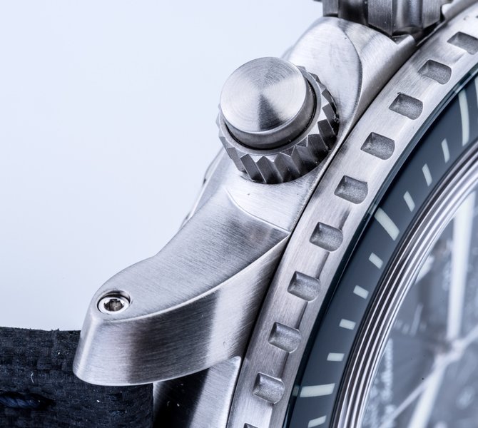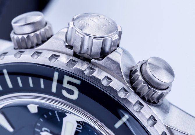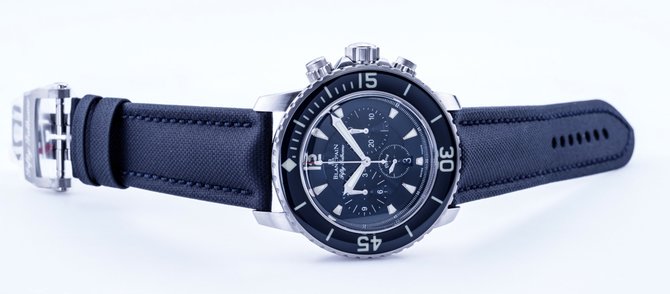 Часовая компания Blancpain пополнила коллекцию "Fifty Fathoms" моделью наручных часов с хронографом в круглом корпусе из нержавеющей стали, диаметром 45 миллиметров. Корпус обладает настоящей дайверской герметичностью в 300 метров. Калибр, установленный в этой часовой модели, функционирует от автоподзавода и обеспечивает индикацию на циферблате часов, минут, секунд, даты и данных со счетчиков хронографа. Циферблат закрыт сапфировым стеклом. Матерчатый ремешок дополнен раскладной пряжкой из стали. Корпус матово-полированный. Заводная головка рифленая. Часовые метки, безель и кончики стрелок покрыты люминесцентным составом.