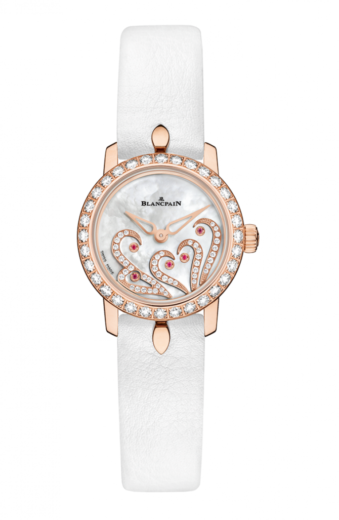 Элегантные женские ультратонкие швейцарские часы от известной компании Blancpain созданы для утонченных и стильных женщин. Механический Калибр 6150 с автоматическим подзаводом состоит из 180 элементов, 29 из них - драгоценные камни. Минимальный запас хода механизма после полного подзавода составляет 40 часов. Диаметр калибра - 15.70 миллиметров; толщина - 3.90 миллиметров. Корпус произведен из розового 18-каратного золота. Диаметр корпуса - 21.5 миллиметров; толщина - 18.7 миллиметров. Корпус декорирован бриллиантами, общий вес которых 0.60 карата. Водостойкость корпуса - 30 метров. Задняя крышка корпуса из сапфирового стекла. Перламутровый циферблат модели инкрустирован белыми бриллиантами. Кожаный ремешок с классической золотой застежкой.