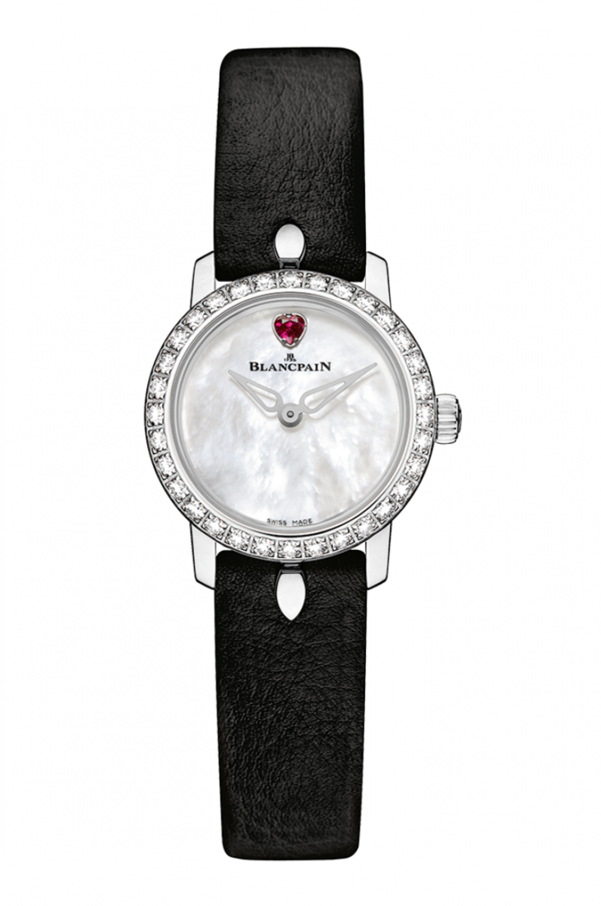 Элегантные женские ультратонкие швейцарские часы от известной компании Blancpain созданы для утонченных и стильных женщин. Механический Калибр 6150 с автоматическим подзаводом состоит из 180 элементов, 29 из них - драгоценные камни. Минимальный запас хода механизма после полного подзавода составляет 40 часов. Диаметр калибра - 15.70 миллиметров; толщина - 3.90 миллиметров. Корпус произведен из белого 18-каратного золота. Диаметр корпуса - 21.5 миллиметров; толщина - 18.7 миллиметров. Корпус декорирован бриллиантами, общий вес которых 0.57 карата. Водостойкость корпуса - 30 метров. Задняя крышка корпуса из сапфирового стекла. Перламутровый циферблат модели инкрустирован белыми бриллиантами. Кожаный ремешок с классической золотой застежкой.