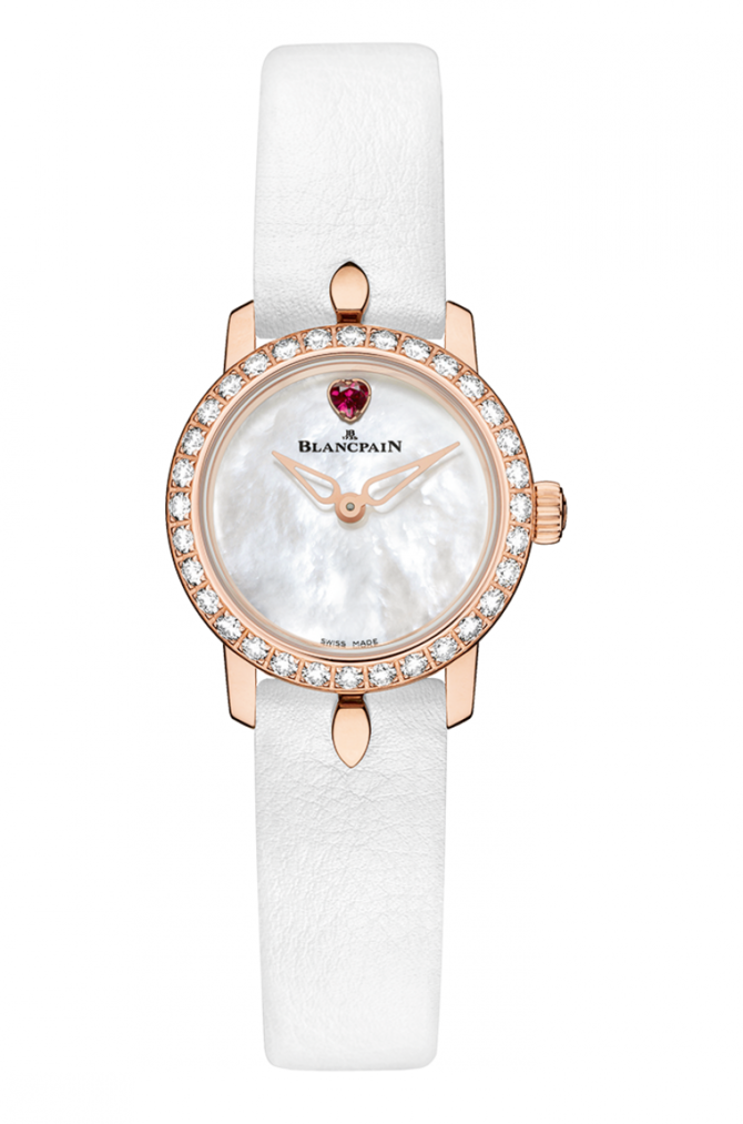 Элегантные женские ультратонкие швейцарские часы от известной компании Blancpain созданы для утонченных и стильных женщин. Механический Калибр 6150 с автоматическим подзаводом состоит из 180 элементов, 29 из них - драгоценные камни. Минимальный запас хода механизма после полного подзавода составляет 40 часов. Диаметр калибра - 15.70 миллиметров; толщина - 3.90 миллиметров. Корпус произведен из розового 18-каратного золота. Диаметр корпуса - 21.5 миллиметров; толщина - 18.7 миллиметров. Корпус декорирован бриллиантами, общий вес которых 0.57 карата. Водостойкость корпуса - 30 метров. Задняя крышка корпуса из сапфирового стекла. Перламутровый циферблат модели инкрустирован 1 красным рубином. Кожаный ремешок с классической золотой застежкой.