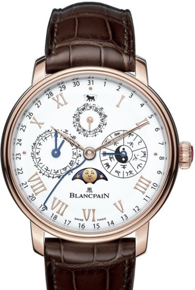 Легендарная часовая марка Blancpain выпустила модель Villeret Traditional Chinese Calendar 00888-3631-55B Ox в корпусе круглой формы из розового 18-каратного золота в диаметре 45 мм. Расположенный внутри этого корпуса мануфактурный механизм 3638 имеет возможность работать без подзавода на протяжении 7 суток. Он обеспечивает наручные часы такими функциями: часы, минуты, секунды, дата, день недели, месяц, фаза луны, знаки зодиака, пять элементов, десять небесных стволов. Циферблат белого цвета со стрелками и часовой разметкой из розового золота защищен надежным, высокопрочным и противобликовым стеклом из натурального сапфирового кристалла. Blancpain укомплектовали модель ремнем из кожи аллигатора коричневого цвета, а также застежкой классического типа из розового золота. Водонепроницаемость корпуса: 30 метров. Заводной ключ инкрустирован рубиновым кабошоном.
