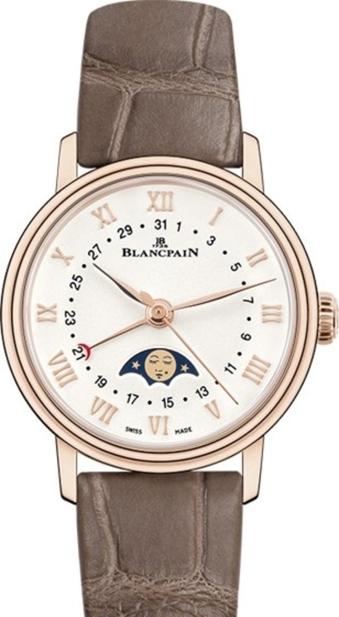 Часовой бренд из Швейцарии Blancpain расширил свою знаменитую коллекцию Villeret шикарными наручными часами в корпусе из розового золота Quantieme Phases de Lune 6106-3642-55A. В часах установлен швейцарский мануфактурный механизм с автоподзаводом от Blancpain - 6654, что отвечает за индикацию времени и главного усложнения - фаз Луны. Диаметр корпуса - 29.2 мм. Сапфировое стекло защищает циферблат от разных повреждений, будь то царапина или удар. Ремешок из высококачественной натуральной кожи аллигатора оснащен раскладывающейся застежкой из розового полированного золота. Круглый золотой корпус с герметичностью до 30 метров. Механизм имеет запас хода, рассчитанный на 72 часа работы.