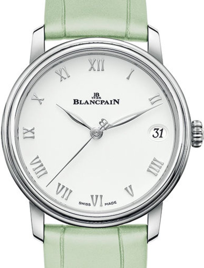 Швейцарская часовая мануфактура Blancpain представила наручные часы Women Villeret Date 33.20mm. Модель отличается корпусом из нержавеющей стали круглой формы, а также мануфактурным швейцарским механизмом Blancpain 1151 с автоматическим подзаводом и запасом хода на 100 часов работы. Ремень из кожи аллигатора салатового цвета дополнен пряжкой из стали классического типа. Корпус имеет базовый уровень герметичности - 30 метров. Белый циферблат накрыт стеклом из натурального сапфирового кристалла с противобликовым покрытием сверху. Часовые римские цифры и стрелки выполнены из стали. Часы выпущены в 2019 году.