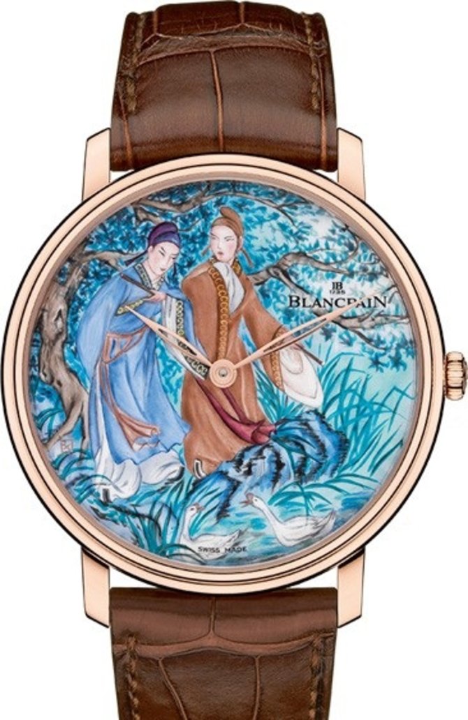 Эти часы, представленные швейцарской компанией Blancpain, выпущена в единственном экземпляре! Модель пополнила коллекцию Villeret. Уникальный циферблат изготовлен в технике горячей эмали. Стекло из сапфира закрывает корпус с обеих сторон. Стрелки на циферблате сделаны из золота. Корпус круглой формы и двухступенчатый безель выполнены из розового 18-каратного золота. Ремень, который в комплекте, руками мастера пошит из натуральной кожи аллигатора коричневого цвета. Калибр 15B, который расположен внутри золотого корпуса, работает от ручного подзавода. Застежка золотая. Запас хода механизма - 40 часов. Водонепроницаемость золотого корпуса швейцарских классических часов - 30 метров.