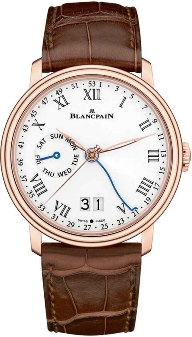 Часы, пополнившие коллекцию Villeret часовой мануфактуры Blancpain, функционируют на мануфактурном механизме 3738G2 с функцией автоподзавода и 8-дневным уровнем запаса хода. На белом циферблате золотыми стрелками указываются такие данные: часы, минуты, секунды, дата, день недели, неделя года. Корпус, размером 42 х 13.4 мм, выполнен из полированного розового золота. Ремень пошит из кожи аллигатора коричневого цвета. Застежка классического типа изготовлена из золота. Корпус герметичен до 30 метров. Швейцарская марка Blancpain существует с 1735 года. Это одна из самых старых компаний на рынке часового искусства. С 1992 года марка входит в состав холдинга Swatch Group.