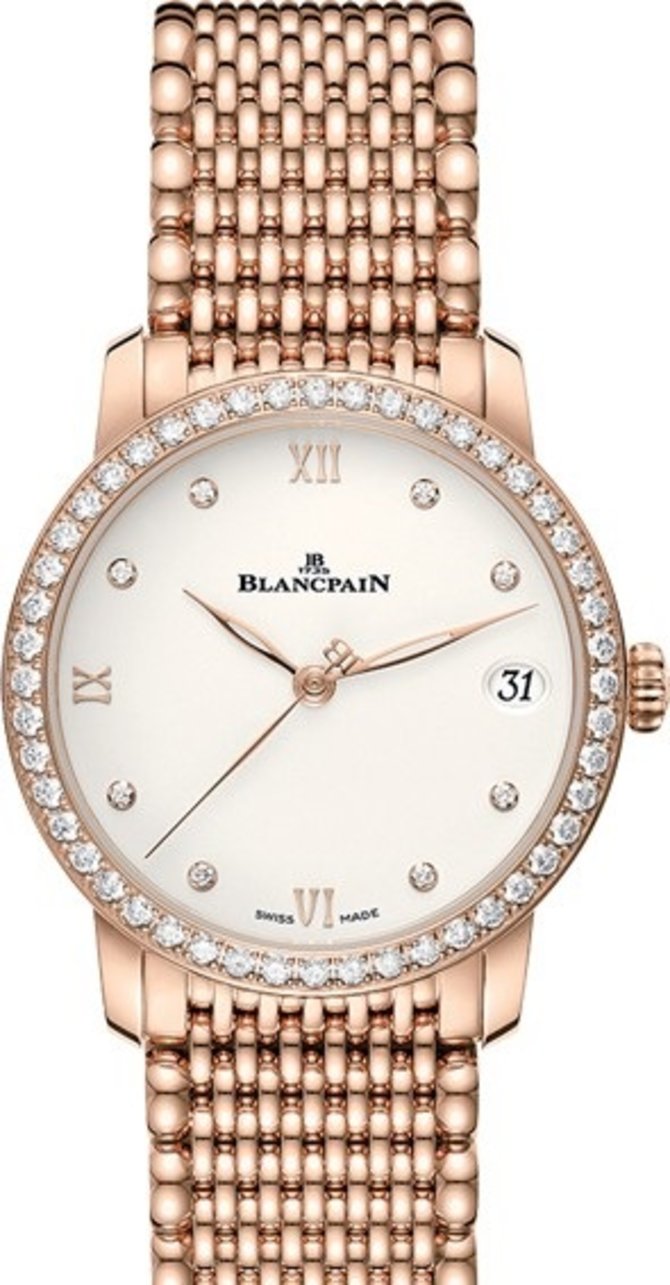 Женские элегантные часы Blancpain Villeret GMT Date 6662 3642 MMB выпущены в корпусе из 18-каратного розового золота, диаметром 40 мм и толщиной 10.28 мм, в комплекте с браслетом из розового золота с раскладной пряжкой, что поможет зафиксировать часы на руке. На белом часовом циферблате с золотыми римскими цифрами и стрелками для индикации данных указываются часы, минуты и секунды, а в области отметки "3 часа" расположен индикатор даты. Также легко считывать показания в темноте, так как на важных элементах циферблата применено люминесцентное покрытие. Устойчивое к царапинам стекло из сапфирового кристалла покрыто противобликовым составом. Водонепроницаемость корпуса рассчитана на 30 метров. Кроме основного времени, модель индицирует и время второго часового пояса. Запас хода установленного автоматического калибра 5A50 - 100 часов.