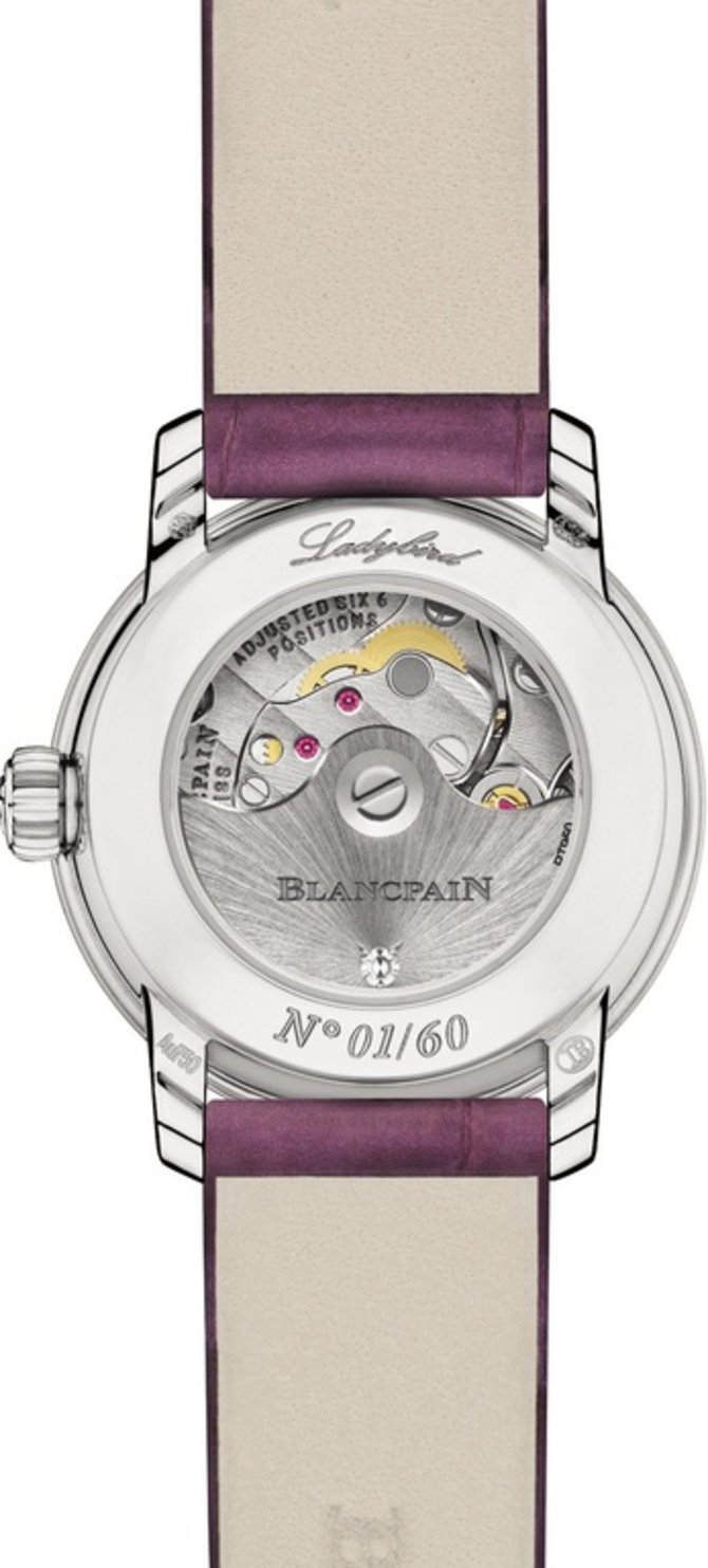 Швейцарские часы женской коллекции Lady Ultraplate от фирмы Blancpain обладают классическим и утонченным образом. Появление этой модели посвящено 60-летию коллекции Ladybird и представлено ограниченной серией из 60 единиц. Установленный механизм в часах с автоподзаводом калибр 6150 на сегодня является одним из маленьких в мире. Этот механизм позволяет отображать часы и минуты. Обеспечивает запас хода 40 часов. Особого внимания заслуживает белый перламутровый циферблат, перелив которого напоминает грани бриллианта. Этот эффект перелива достигнут путем размещения перламутровых элементов в виде листочков. Корпус выполнен из 18-каратного белого золота. Безель инкрустирован 32 бриллиантами. Также на циферблате на месте восьми часовых отметок размещены белые бриллианты. Сапфировая задняя крышка позволяет увидеть деликатно инкрустированный бриллиантом ротор. Исключительное совершенство модели придает розовый ремешок из кожи аллигатора с особым рисунком и с вставкой из 18-каратного белого золота.