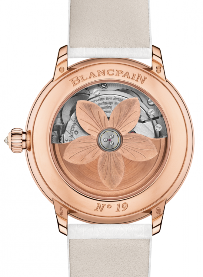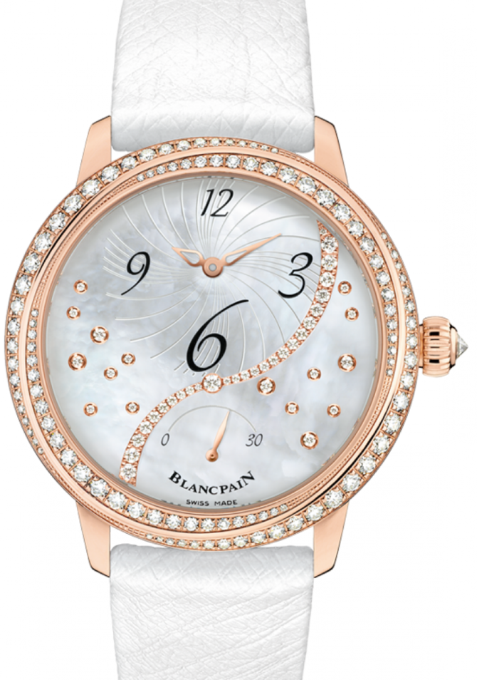 Часовой механизм данной модели-новинки женских швейцарских часов 2014 года от компании Blancpain с автоматическим заводом, который состоит из 226 компонентов и 34 драгоценных камней, имеет 72-часовой запас хода. Корпус часов произведен из 18-каратного розового золота высшего качества, контур безеля полностью инкрустирован белыми бриллиантами, заводная головка также украшена белым бриллиантом. Размеры корпуса из розового золота: диаметр - 36.8 мм, толщина - 10.3 мм. И задняя крышка, и основное лицевое защитное стекло выполнены из сапфира. Водонепроницаемость часов - 30 метров. В комплекте браслет, произведенный из кожи страуса, с раскладной застежкой, выполненной из розового золота. Часы имеют кремниевую спираль, малую ретроградную секундную стрелку, смещенную от центра часовой стрелкой. Циферблат часов с перламутровым оттенком и с нанесением довольно крупных для восприятия символов, украшен белыми бриллиантами. Бренд Blancpain - это олицетворение инновационных технических идей мастеров часового производства в уникальном стильном корпусе.