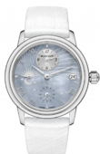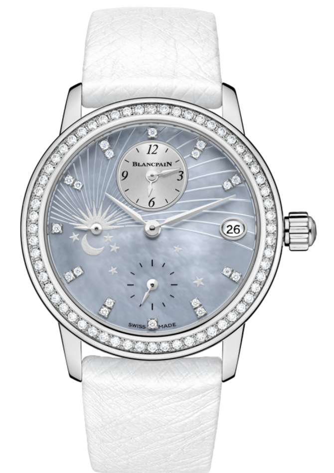 Эксклюзивная продажа этих уникальных часов производится исключительно в бутиках Blancpain. Данный часовой механизм новинки женских часов 2014 года от компании Blancpain с автоматическим заводом. Он содержит в себе 253 компонентов и 30 драгоценных камней. Запас хода модели - 100 часов. Корпус выполнен из белого 18-ти каратного золота, белыми бриллиантами украшен безель и часовые метки. Размеры золотого корпуса: диаметр - 34 мм, толщина - 10.4 мм. Задняя крышка и лицевое защитное стекло выполнены из сапфира. Водонепроницаемость часов - 100 метров. Лот из пяти сменных ремешков с обычной застежкой. Часы владеют кремниевой спиралью и функцией времени двух часовых поясов. Также указателями день/ночь и даты. Циферблат - перламутрового оттенка, украшен бриллиантами. Швейцарский бренд-производитель часов высшего класса Blancpain был основан еще в 1735 году Жан-Жаком Бланпа. В то время компания была похожа на маленькую мастерскую, находящуюся в швейцарской деревне Вильре. Уровня завода мастерская достигла с помощью старшого сына Давида-Луи - Фредерика-Луи.