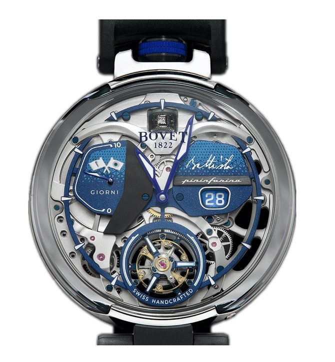 Часовая марка Bovet и компания Automobili Pininfarina представила модель наручных часов Pininfarina Battista Tourbillon с такими функциями: часы, минуты, секунды, дата, турбийон, индикатор запаса хода. Корпус круглой формы изготовлен из титана и с двух сторон защищен стеклом из сапфирового кристалла. Механический калибр 16BM01TVGD с запасом хода на 240 часов - мануфактурная разработка Bovet. На запястье часы крепятся с помощью ремня из каучука. Герметичность корпуса - 30 метров.