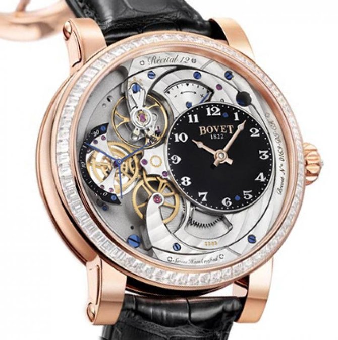 Швейцарские часы с механизмом, функционирующим от ручного завода и обладающим недельным запасом хода, представлены известной часовой фирмой Bovet. Этот механизм помещен в необычный скелетонизированный золотой корпус. Ремешок из крокодильей кожи с классической пряжкой, выполненной также из золота, идет в комплекте. Водонепроницаемость (герметичность) золотого корпуса равна 30 метрам глубины. В наручных часах таится философия и мастерство, находчивость и техническая изобретательность их создателей. Часы и их чарующий мир: невероятные функциональные усложнения, современные технические новшества, неразрывная связь с культурой и историей человечества. Первые наручные часы были, по сути, браслетом, украшением на запястье. С тех пор изменилось многое, но темы часов и ювелирных украшений, так и идут рука об руку. На аукционах коллекционеры готовы платить огромные деньги за антикварные часы Bovet. В 1997 году талантливый молодой бизнесмен и страстный коллекционер часов Паскаль Раффи решил возродить славу марки Bovet. Главной целью было не создание новодела, эксплуатирующего известное имя, а скрупулезное восстановление всех отличительных особенностей часов: эксклюзивные механизмы, уникальные техники оформления (роспись по эмали и перламутру) и даже форма корпуса, наследующая классическое строение карманных часов XIX столетия.
