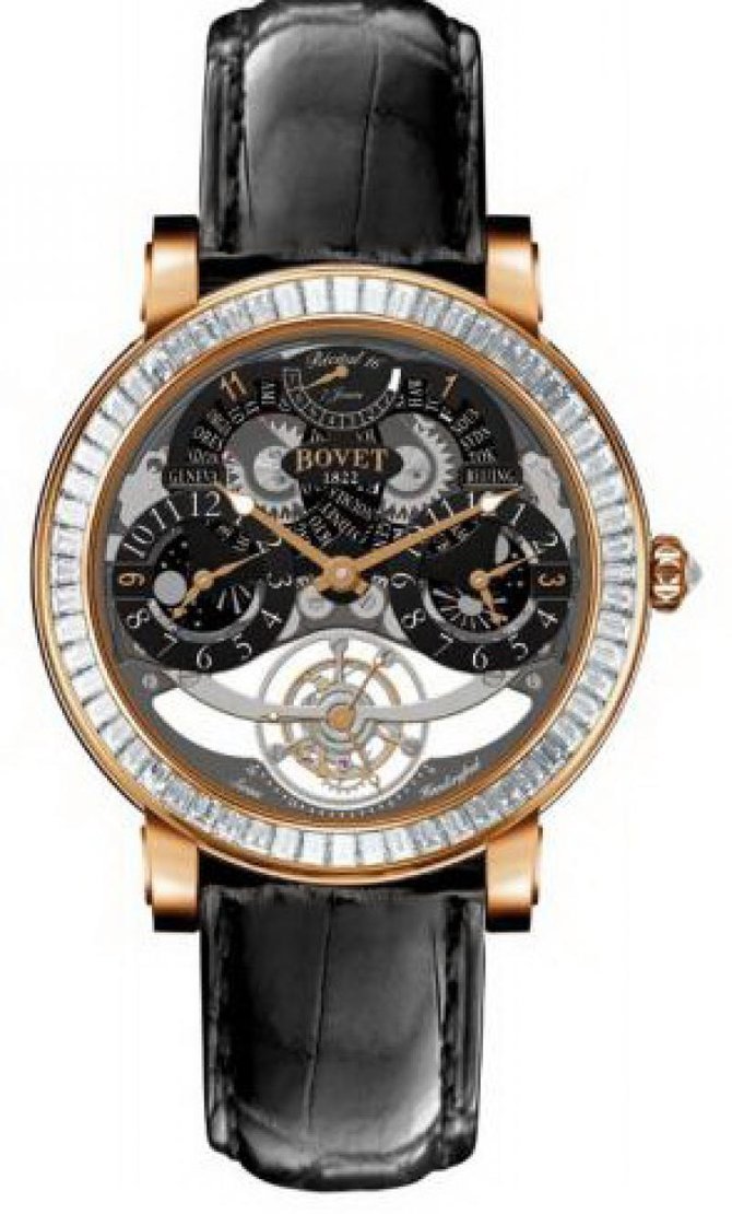 Эти швейцарские часы представлены авторитетнейшей компанией на мировом часовом рынке - Bovet. Лимитированная модель пополнила шикарную коллекцию бренда - "Dimier Collection". Часы обладают разнообразными сложными функциями — они показывают часы, минуты, секунды; 3 часовых зоны; индикаторы - день/ночь, запаса хода, различных 24-х городов. Элегантно и, одновременно, стильно выглядит дизайнерский замысел изготовленного корпуса, в который мастера фирмы поместили механизм с турбийоном и недельным запасом хода. Частота баланса механизма из 68 элементов - 21600 пк в час. Надежную защиту часам обеспечивает сапфировое антибликовое стекло, устойчивое к серьезным повреждениям. Пройти мимо и не купить этот часовой шедевр означает совершить над собой насилие. В очередной раз техническая изысканность, а также мастерство сливаются с искусством: с первого взгляда поражает гармоничное сочетание механизма и корпуса, формирующее уникальный, особый часовой шедевр. Вы сможете обратить на себя внимание и на вечернем приеме, и в офисе, продемонстрировав хороший вкус даже в таких шикарных мелочах, как Ваши наручные часы.