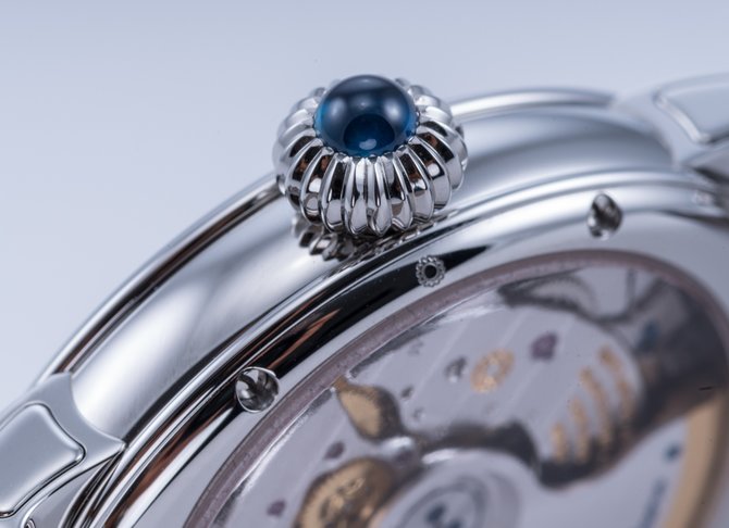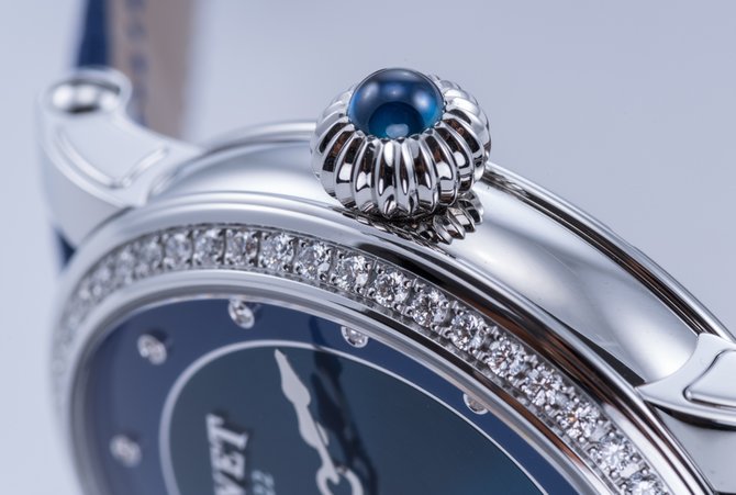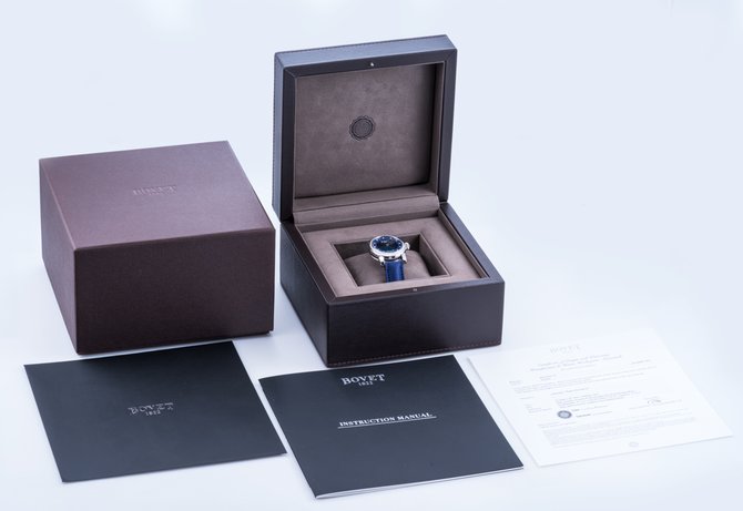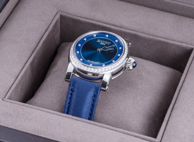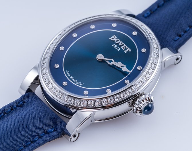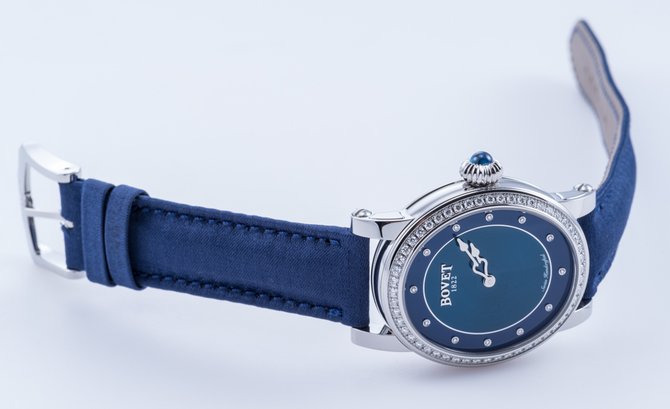 Bovet представил женские часы коллекции Dimier в 31-миллиметровом корпусе из нержавеющей стали с инкрустацией 52-мя бриллиантами, общим весом 0.69 карата. Индикацию часов и минут обеспечивает автоматический калибр 11DA17 с 72 часами запаса хода. Овальный корпус с 30-метровой герметичностью. Синий лакированный циферблат накрыт сапфировым стеклом. Атласный ремешок с классической стальной пряжкой в комплекте. На месте часовых меток установлены белые классические бриллианты. Заводная головка украшена синим сапфиром-кабошоном. Балансовая частота - 28 800 пк/ч. При отделке циферблата использовалась техника сатинирования вручную. Модель швейцарских часов Bovet Dimier Recital 19 Miss R19S0001-SD1 собрана вручную инженерами Bovet.