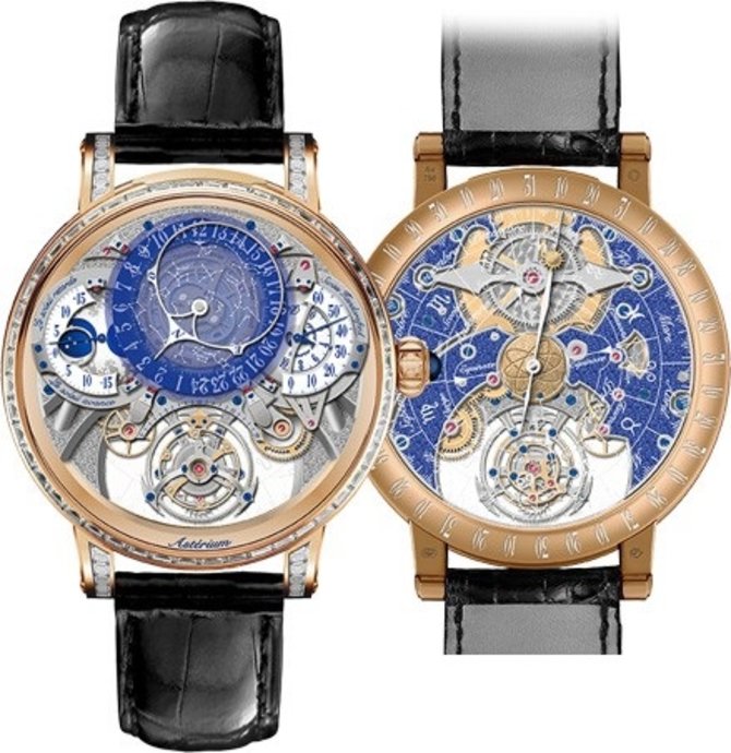 В круглом корпусе из розового золота, который украшен багетными бриллиантами в белом цвете, представлена новинка 2017 года от Bovet - швейцарские часы с двумя циферблатами Dimier Recital 20 Asterium R20N001-SB123. Модель выполняет широкий спектр функций на мануфактурном калибре 17DM02-SKY, разработанном Bovet. Данный механизм имеет длительный запас хода - 10 дней. Также калибр обладает функцией турбийона. Оба циферблата скелетонированы и накрыты сапфировыми стеклами. Функции часов: часы, минуты, секунды, дата, запас хода, фаза луны, уравнение времени, индикатор зодиака. Водонепроницаемость корпуса - 30 метров. Ремень, что в комплекте, из кожи аллигатора.