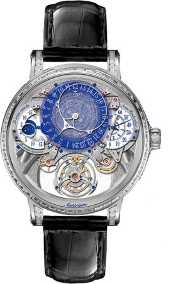 Модель Bovet Dimier Recital 20 Asterium R20N003-SB123 оснащена двумя циферблатами, сквозь защитное стекло которых указывается широкий набор функций и дополнительных усложнений: часы, минуты, секунды, дата, запас хода, фаза луны, уравнение времени, индикатор зодиака. Корпус из платины 950 инкрустирован багетными бриллиантами. Оба циферблата скелетонированы. Ремешок, которым комплектуется модель, руками мастера пошит из крокодиловой кожи. Цвет ремешка - черный. Функциональность обеспечена швейцарским мануфактурным калибром 17DM02-SKY с турбийоном от Bovet. Запас хода механизма - 10 дней. Важные элементы циферблатов с применением антибликового состава Super-LumiNova, который позволяет видеть показания данных при любом освещении.