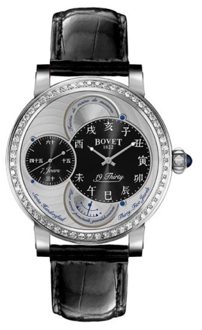 Модель швейцарских часов Bovet 19Thirty Dimier RNTS0006-SD1 созданы для людей с чувством стиля. Часы вошли в легендарную коллекцию Dimier. Украшены бриллиантами классической огранки белого цвета. Корпус из нержавеющей стали выполнен в диаметре 42 мм и толщиной 9.22 мм. Механический калибр с ручным подзаводом 15BM04 обеспечивает индикацию времени и уровня запаса хода, имеет 7-дневный запас хода и частоту баланса 21600 пк/час. На циферблате, что защищен прозрачным антибликовым стеклом из сапфирового кристалла, установлены стрелки с люминесцентным покрытием, что указывают на китайскую часовую разметку. Ремень из крокодиловой кожи черного цвета пошит вручную. Застежка сделана из стали. Водонепроницаемость корпуса на уровне 30 метров.