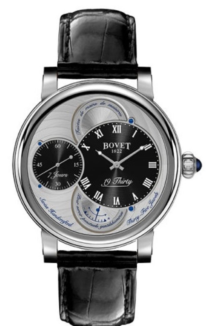 Классические часы Bovet 19 Thirty Dimier RNTS0008 выпущены в элегантном дизайне, который характерен моделям швейцарского часового бренда Bovet, имеющим популярность в мире в 1930 годах. На серебристо-черном циферблате с защитным стеклом из сапфирового кристалла осуществляется индикация текущего времени и уровня запаса хода механизма. Часы фиксируются на руке при помощи черного ремня из крокодиловой кожи и застежка из стали классического типа. Ремешок является ручной работой специалистов Bovet. 42-миллиметровый полированный корпус сделан из стали. В корпусе установлен механизм с ручным подзаводом 15BM04, который отличается рядом преимуществ: частота баланса 21600 пк/час, 7-дневный запас хода, индикатор запаса хода на циферблате, индикация текущего времени. Корпус обладает 30-метровой герметичностью. Римские цифры и стрелки при плохом освещении светятся белым цветом благодаря люминесцентному покрытию.