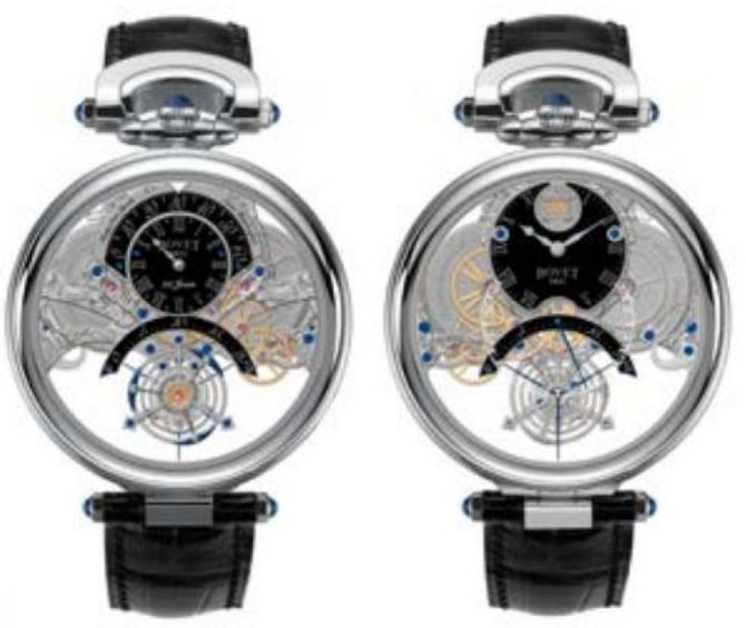 Качественные наручные швейцарские часы, кроме своей основной функции - контроля времени, еще выполняют функцию придания владельцу имиджа преуспевающего делового человека. Представленная модель с двусторонним циферблатом является представителем оригинальных швейцарских часов производства авторитетной компании на рынке часовой индустрии - Bovet и входит в шикарную коллекцию бренда - Fleurier Amadeo Grand Complications. Как и все другие часы этой коллекции, представляемую модель можно носить как карманные часы, всего лишь заменив кожаный ремешок на специальную цепочку, которая идет в комплекте. Корпус швейцарских часов произведен из белого золота и наделен механизмом с турбийоном, ручным заводом и впечатляющим запасом хода - 528 часов, то есть 22 дня. Также часы обладают кожаным ремешком (кожа аллигатора) с классической пряжкой, выполненной из золота. Герметичность золотого корпуса равна 30 метрам глубины. Bovet приобрела фабрику “Шато де Мотье” в городке Валь-де-Травер, а почти десять лет назад — еще три производственных мощности, и ее желание стать мануфактурой перестало быть всего лишь фантазией. STT Complications SA (бывшая Progress Watch, разработчик и производитель турбийонов), STT Mechanical Movements SA (производитель калибров), STT SPIR-IT (балансовые пружины), STT Watch U Licence (патенты) и Aigat (тиснение) — Паскаль Раффи купил все эти компании и объединил их в городке Трамелан.