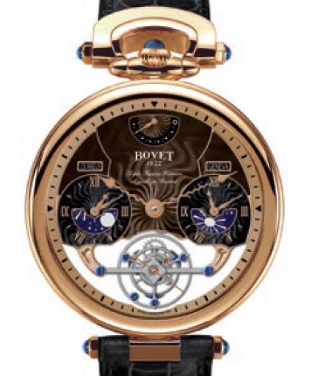 Превосходные швейцарские часы от компании Bovet, входящие в необычную коллекцию Fleurier Amadeo Grand Complications, вышли в массивном круглом корпусе, произведенном из качественного чистого золота. Главная особенность этой модели заключается в том, что она обладает способностью перевоплощения из наручных часов в карманные; для этого нужно всего лишь снять кожаный ремешок и надеть специальную цепочку, идущую в комплекте. На уникальном двустороннем циферблате отображаются: часы, минуты и секунды; расположены индикаторы запаса хода, городов 2 и 3 часовых зон, дня/ночи, 2 и 3 часовой зоны. Часовые циферблаты тщательно оберегаются прочным сапфировым стеклом. Модель оснащена механизмом с турбийоном, который функционирует благодаря ручному заводу, с 168-часовым запасом хода. Также часы наделены ремешком из кожи атлантического аллигатора с классической золотой пряжкой для удобной фиксации модели на запястье своего владельца. Крепежи браслета/ремешка украшены синими сапфировыми камнями. Престижные, броские, запоминающиеся функциональные часы знаменитого бренда с необычным механизмом и актуальными усложнениями. Комфорт повышают безупречно обработанный корпус и нежно выделенная с внутренней стороны поверхность крокодилового ремешка. Даже суровая нить почти не ощущается.