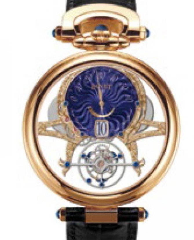 Превосходными уникальными часами, входящими в необычную брендовую коллекцию "Fleurier Amadeo Grand Complications", удивила часовое общество компания Bovet, рожденная в далеком 1920 году в самой что ни на есть часовой стране - Швейцарии. Модель вышла в массивном круглом корпусе, произведенном из качественного чистого золота. Главная особенность этой модели заключается в том, что она обладает способностью перевоплощения из наручных часов в карманные; для этого нужно всего лишь снять кожаный ремешок и надеть специальную цепочку, идущую в комплекте. На впечатляющем двустороннем циферблате отображаются: прыгающие часы и минуты, секунды; а также расположены индикатор запаса хода механизма и окошко турбийона. Часовые циферблаты тщательно оберегаются прочным сапфировым стеклом. Модель обладает швейцарским механизмом от Jaquet Droz с турбийоном, который функционирует от ручного подзавода, с 120-часовым запасом хода. Также часы наделены ремешком из качественной кожи аллигатора с классической золотой пряжкой для удобной фиксации наручных часов на запястье своего владельца. Крепежи браслета/ремешка украшены синими сапфировыми камнями.
