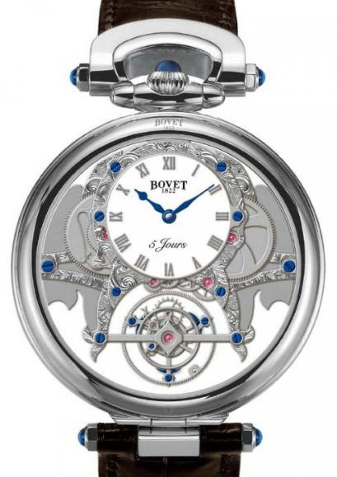 Настоящие швейцарские часы, помимо своей основной функции - контроля времени, еще выполняют функцию придания владельцу имиджа преуспевающего делового человека. Уникальная представленная модель с двусторонним циферблатом является представителем оригинальных швейцарских часов производства авторитетной компании на рынке часовой индустрии - Bovet и входит в шикарную коллекцию бренда - Fleurier Amadeo Grand Complications. Как и все другие часы этой коллекции, представляемую модель можно носить как карманные часы, всего лишь заменив кожаный ремешок на специальную цепочку, которая идет в комплекте. Корпус швейцарских часов произведен из белого золота и наделен механизмом с турбийоном, ручным заводом и запасом хода - 120 часов. С его помощью на циферблате индицируются часы, минуты, секунды и индикатор запаса хода. Также часы обладают ремешком из качественной крокодильей кожи с классической пряжкой, выполненной из золота. Герметичность золотого корпуса равна 30 метрам глубины. Серия ограничена - 20 моделей на весь мир.