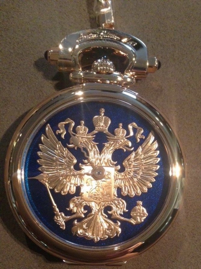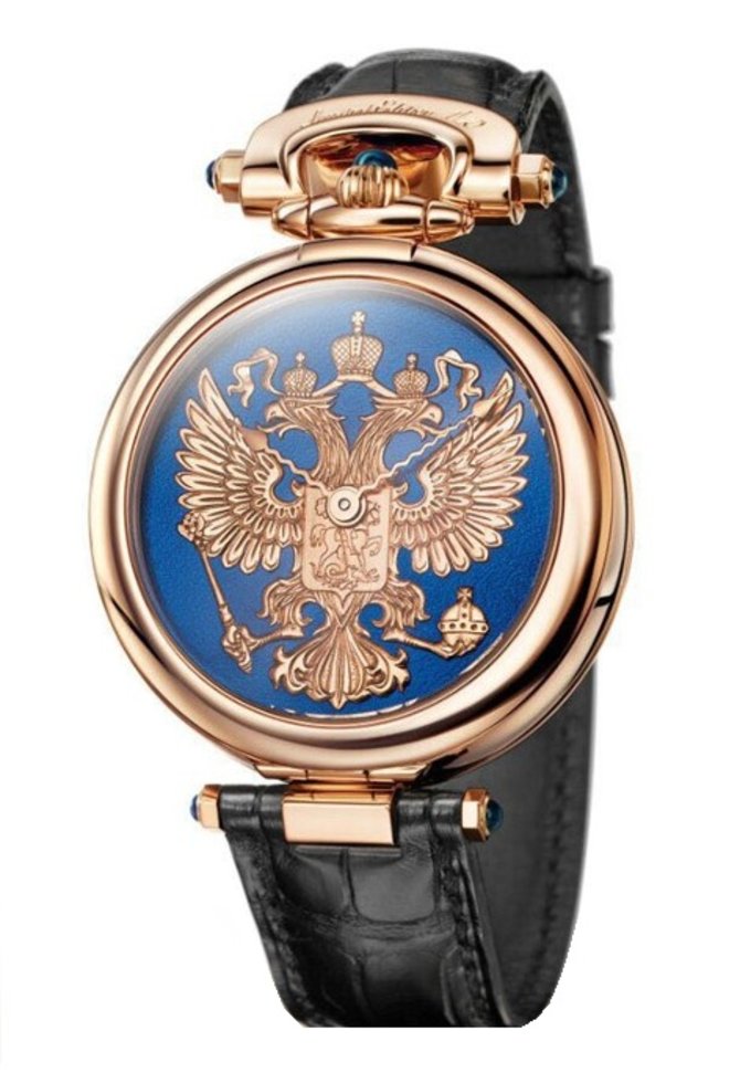 Легендарная часовая мануфактура Bovet лимитированной серией выпустила механические часы, посвященные России. Ограниченный тираж составил всего 10 экземпляров на весь мир. Корпус новинки выполнен из розового золота. Внутри корпуса швейцарских часов, посвященных Российской Федерации, установлен мануфактурный механизм с ручным подзаводом и 7-дневным запасом хода. Модель имеет два циферблата, защищенных сапфировым стеклом с антибликовым покрытием. На первом циферблате, выполненном из синей эмали, расположен герб России из розового золота и две золотые стрелки для индикации часов и минут. На втором полускелетонизированном циферблате указываются часы и минуты, а также находятся индикатор уровня запаса хода и каретка секундного счетчика (в районе 6-часовой отметки). Заводная головка, расположенная вверху корпуса, и фиксаторы ремешка декорированы сапфирами-кабошонами. Модель комплектуется золотой цепочкой для карманной носки и ремешком из натуральной кожи аллигатора с золотой пряжкой для фиксации часов на запястье. Водонепроницаемость корпуса - 30 метров.