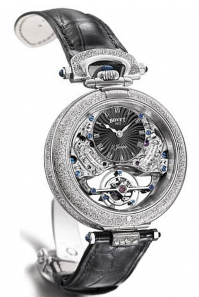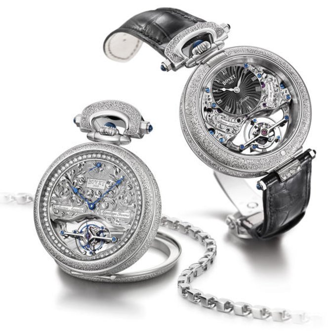 Наручно-карманные часы с двусторонним циферблатом, представленные швейцарской компанией Bovet, обладают круглым корпусом из белого 18-каратного золота, в котором удобно расположился инновационный механизм с ручным подзаводом и турбийоном, благодаря которому модель способна индицировать часы, минуты, секунды и уровень запаса хода. Представляемая модель пополнила роскошные ряды коллекции Fleurier. Золотой корпус герметичен до 30 метров глубины. Укомплектованы швейцарские механические часы ремешком, изготовленным из крокодильей кожи и цепочкой из белого золота. С ремешком идет золотая классическая застежка. Особенностью этой модели, помимо двух циферблатов, является возможность носить часы как карманные, заменив кожаный ремешок на специальную цепочку. Часовые циферблаты модели находятся под надежной защитой сапфирового стекла с антибликовым покрытием. Фиксаторы браслета и заводная головка украшены синими драгоценными камнями.