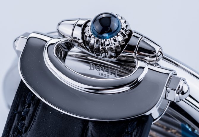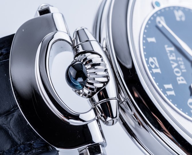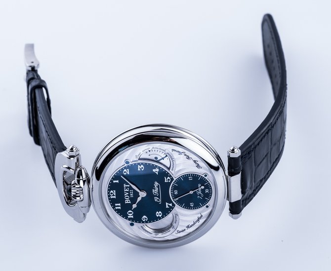 Калибр 15BM04 с ручным подзаводом, расположенный внутри круглого полированного корпуса из нержавеющей стали, отличается достойным запасом хода на 7 дней. Диаметр корпуса - 42 мм; толщина - 9.05 мм. На циферблате часов, что поделен на несколько зон для индикации данных, указываются часы, минуты, секунды и запас хода механизма. Ремень из кожи крокодила поможет закрепить часы на руке. Заводная головка с установленным синим сапфиром находится вверху корпуса. Корпус с 30-метровым уровнем герметичности. Защищен циферблат сапфировым стеклом с многослойным антибликовым покрытием. Застежка классическая. Часы созданы в стиле старых карманных часов ТМ Bovet, выпускаемых еще в начале ХХ века.