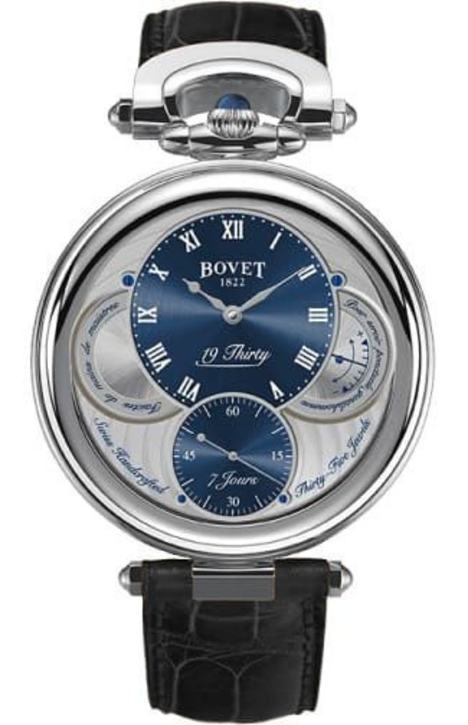 Изысканные швейцарские часы Bovet с функцией индикации часов, минут, секунд и запаса хода работают на базе механического калибра с ручным подзаводом - 15BM04, который разработан инженерами дочерней компании Bovet - Dimier 1738. Корпус часов круглой формы, диаметром 42 мм, изготовлен из полированной нержавеющей стали. Толщина корпуса всего 9.05 мм. Установленный механизм имеет 7-дневный запас хода. Ремень, которым укомплектован данный аксессуар, пошит из кожи аллигатора. Герметичность стального корпуса до 30 метров (3 атм). Стекло, что защищает циферблат, изготовлено из натурального сапфирового кристалла с антибликовым покрытием. Дизайн модели Amadeo 19Thirty разработан в духе старых карманных часов от Bovet. Индикатор запаса хода находится сзади корпуса. Его видно через сапфировую заднюю крышку.